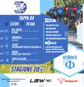 Domenica 13 aprile 2025 si terrà la quarta tappa del circuito Opes “Giro dell’Agro Pontino” denominata “XVII Trofeo Ifi Bike” ed organizzata dall’omonima società asd Ifi Bike.
