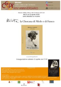 Sabato 12 aprile alle ore 17 presso il Museo della Città e del Territorio di Cori sarà inaugurata “Mèlitta la Chorana di miele e di fuoco”, mostra, curata da Giorgio Bianchi, che rivela una storia, ignota a tutti ma profonda, vissuta da una corese e il celebre Vate. Letizia Giupponi De Felici era nata infatti a Cori da famiglia corese agli inizi del 1900. Per circa quindici anni, nel periodo che di poco precedette la morte di Gabriele d’Annunzio, fu sua intima amica e assidua frequentatrice della residenza gardonese del Poeta. Un fitto epistolario tra lettere e telegrammi, dei quali 253 di lui e 484 di lei intercorsi tra i due nel corso degli anni, dimostra la stretta e duratura amicizia tra il Vate e Mèlitta.