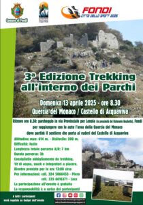 Torna “Trekking all’interno dei Parchi”, l’evento sportivo e naturalistico dedicato alle aree protette della Piana di Fondi ormai giunto alla sua terza edizione. L’appuntamento con l’escursione primaverile amata da grandi e piccini è per domenica 13 aprile alle 8:30. Destinazione: Quercia del Monaco e Ruderi di Acquaviva. L’evento si propone di promuovere l’attività fisica e l’importanza di trascorrere del tempo di qualità all’aria aperta.