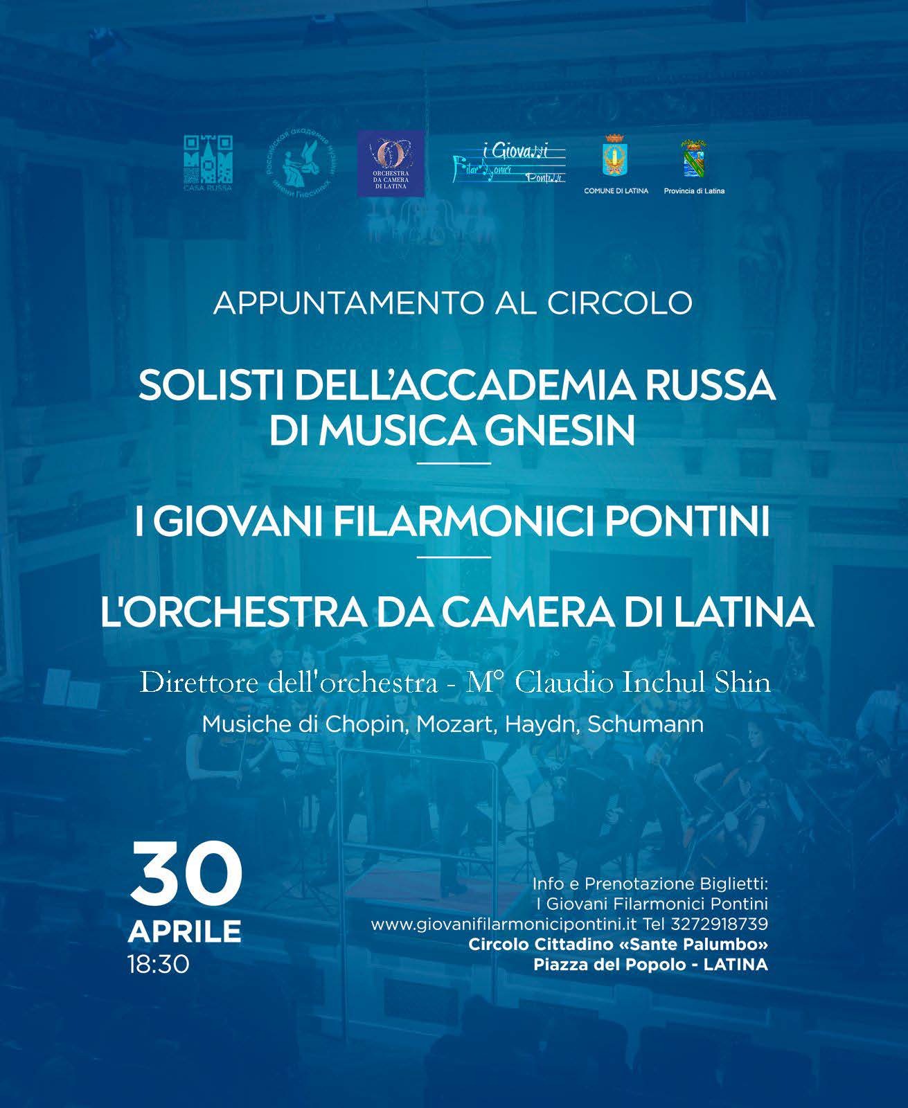 Due gli appuntamenti da non perdere all’insegna della grande musica classica, martedì 29 e mercoledì 30 aprile, l’Orchestra da Camera di Latina e I Giovani Filarmonici Pontini si esibiranno insieme ai solisti dell’Accademia Musicale Russa Gnessin, diretti dal Maestro Inchul Shin. Il primo concerto si terrà martedì 29 aprile alle ore 18.30 presso la Casa Russa a Roma, il secondo appuntamento è previsto per mercoledì 30 aprile sempre alle ore 18.30 al Circolo cittadino “Sante Palumbo” di Latina, nell’ambito della rassegna Appuntamento al Circolo. Il concerto, organizzato dall’Associazione di Promozione Sociale “I Giovani Filarmonici Pontini”, vede il patrocinio della Provincia e del Comune di Latina. Il concerto vedrà protagonisti gli studenti più talentuosi dell’Accademia, che proporranno un programma ricco e raffinato, con capolavori di Mozart, Schumann, Haydn e Chopin. Tra i solisti: Polina Eremkina, Polina Sunyaykina, Yu Yan Lui (Cina), Vladimir Bondar al pianoforte e Daniil Petrov al violoncello. Tra i solisti spiccano storie diverse ma unite da una passione comune per la musica: Polina Sunyaykina, vincitrice di concorsi internazionali, è al termine del suo quarto anno accademico, mentre Yu Yan Lui sta concludendo la sua formazione post-laurea ed è già attiva nell’insegnamento.