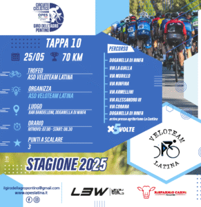 Domenica 25 maggio si terrà il Trofeo Asd Veloteam Latina. La tappa numero dieci del Giro Dell’Agro Pontino Opes sarà realizzata sotto l’organizzazione dell’omonima società asd Veloteam Latina. Gli atleti sono chiamati a radunarsi per le 7 presso il Bar Bandelloni a Doganella di Ninfa. La partenza sarà data alle 8.30. Per giungere al traguardo posto presso l’agriturismo “La Cantina”, si dovrà percorrere per cinque volte il tracciato di gara e nello specifico si partirà da Doganella Di Ninfa e si proseguirà per via La Gialla, via Murillo, via Ninfina, via Armellini, via Alessandro III, via Corana e rientro a Doganella Di Ninfa.