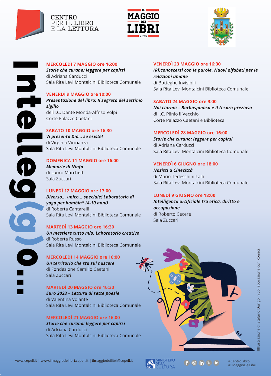 Si comincia questo pomeriggio, 7 maggio, alle ore 16 con la presentazione di “Storie che curano: leggere per capirsi” di Adriana Castellucci, evento che sarà ospitato nella Sala Rita Levi Montalcini della Biblioteca comunale e che sarà riproposto anche mercoledì 21 maggio alle ore 16 e mercoledì 28 maggio alla stessa ora. Venerdì 9 maggio alle ore 10 “Il segreto del settimo sigillo” a cura dell’istituto comprensivo Monda-Volpi presso la Corte di Palazzo Caetani; sabato 10 maggio alle ore 16.30 in Sala polifunzionale “”Vi presento Dio… se esiste!”; domenica 10 maggio sempre alle ore 16.30 Lauro Marchetti presenterà in Sala Zuccari il suo volume “Memorie di Ninfa”. Lunedì 12 maggio alle ore 17 la Sala Rita Levi Montalcini ospiterà “Diverso… unico… speciale!”, laboratorio di yoga per bambini dai 4 ai 10 anni di età. Dedicato ai più piccoli anche l’evento di martedì 13 maggio alle ore 16.30 “Un mestiere tutto mio. Laboratorio creativo” di Roberta Cantarelli. Mercoledì 14 maggio alle ore 16.30 in Sala Zuccari sarà presentato il volume della Fondazione Camillo Caetani “Un territorio che sta sul nascere”; martedì 20 maggio alle ore 16.30 in Sala Rita Levi Montalcini sarà la volta di “Euro 2023 – Lettura di sette poesie” di Valentina Volante; venerdì 23 maggio alle ore 16.30 “(Ri)conoscersi con le parole. Nuovi alfabeti per le relazioni umane” di Botteghe invisibili; sabato 24 maggio alle ore 9 la Corte di Palazzo Caetani e la Biblioteca ospiteranno “Noi ciurma – Barbarossa e il tesoro prezioso” a cura dell’istituto comprensivo Plinio il Vecchio; venerdì 6 giugno alle ore 18 Mario Tedeschi Lallini presenterà il volume “Nazisti a Cinecittà” poi lunedì 9 giugno alle 18 in Sala Zuccari ultimo appuntamento con “Intelligenza artificiale tra etica, diritto e occupazione” di Roberto Cecere.