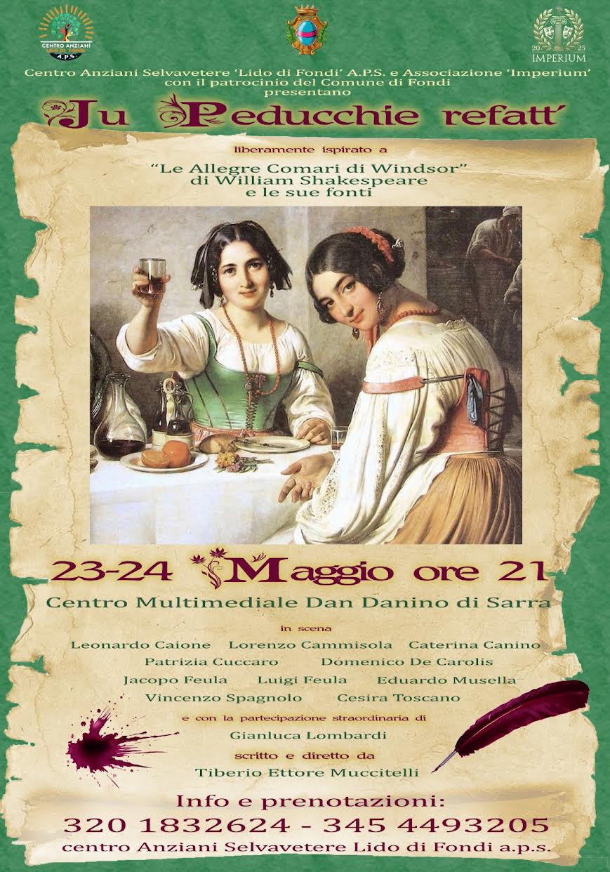 Dopo aver debuttato con successo lo scorso anno, la compagnia teatrale del Centro anziani Selvavetere Lido di Fondi A.p.s. si mette nuovamente in gioco, sempre sotto la guida del regista Tiberio Ettore Muccitelli. Venerdì 23 e sabato 24 maggio, alle ore 21:00 gli attori andranno in scena presso il centro multimediale “Dan Danino di Sarra” con una nuova affascinante sfida. Questa volta la compagnia sarà guidata dal giovane regista fondano nell’intricato intreccio di una divertente commedia pluridialettale, dal titolo Ju Peducchie Refatt’, scritta dallo stesso Muccitelli e liberamente ispirata a Le allegre comari di Windsor di William Shakespeare e le sue fonti.