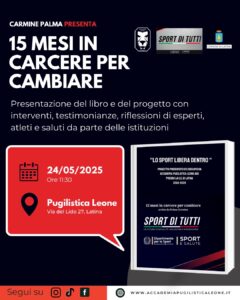 Sabato 24 maggio, alle ore 11:30, presso la palestra dell’Accademia Pugilistica Leone in via del Lido 27 a Latina, si terrà la presentazione ufficiale del libro “15 mesi in carcere per cambiare” di Carmine Palma, tecnico della storica palestra pontina.