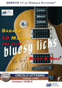 I Bluesy Licks sono pronti a tornare ad esibirsi a Latina e, più precisamente, al Circolo Cittadino “Sante Palumbo”, con “The best from UK”. L’appuntamento è fissato per sabato 10 maggio, alle ore 21:30, con una serata dalle sonorità blues e rock nel cuore della città capoluogo. Un evento organizzato per il secondo anno consecutivo dall’associazione culturale Centro Turistico Giovanile “Latina in itinere”, attiva ormai da oltre dieci anni sul territorio pontino.