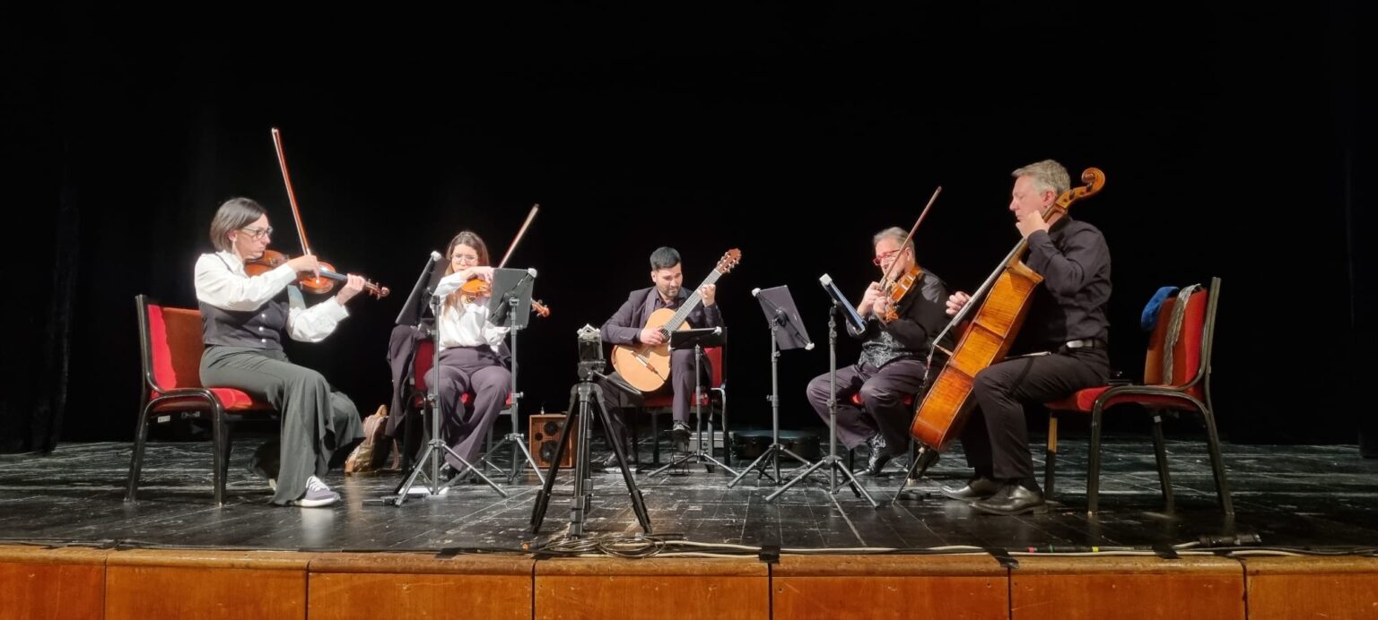 Tripudio di applausi per il Quintetto Kleos al Teatro D’Annunzio di Latina, una serata di grande intensità musicale ed emotiva quella andata in scena ieri, domenica 18 maggio, alle ore 19:00, in occasione del Concerto di Primavera. La formazione, composta da Simone Salvatori alla chitarra, Marika Mazzotta e Ilenia Lombardi ai violini, Francesco Negroni alla viola e Francesco Marquez al violoncello, ha saputo conquistare il pubblico con un repertorio variegato, raffinato e coinvolgente. Un vero e proprio viaggio musicale che ha attraversato stili e generi diversi, dai vivaci colori della musica spagnola di Boccherini e De Falla, fino alle suggestive sonorità dei Beatles, reinterpretate attraverso gli originali arrangiamenti di Leo Brouwer. Particolarmente toccante il momento in cui, prima dell’esecuzione del celebre brano “Yesterday”, il giovane chitarrista Simone Salvatori ha voluto rendere omaggio a due persone speciali, Massimo e Vincenzo, con parole cariche di emozione; «Yesterday, uno di quei brani che sussurra la nostalgia del tempo andato, il ricordo di ciò che abbiamo amato e che oggi ci manca. A voi questa musica, come un abbraccio che attraversa il tempo».