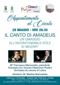 Prosegue la rassegna Appuntamento al Circolo, appuntamento mercoledì 28 maggio alle ore 20.30, al Circolo Cittadino “Sante Palumbo” in Piazza del Popolo a Latina. Protagonista della serata la musica senza tempo di Wolfgang Amadeus Mozart, riletta attraverso il concerto “Il canto di Amadeus – un omaggio all’inconfondibile stile di Mozart”. Sul palco, il giovane e acclamato pianista M° Francesco Mazzonetto, talento torinese che ha già calcato le scene internazionali con carisma e profondità interpretativa, accompagnato dall’Orchestra de I Giovani Filarmonici Pontini e dall’Orchestra da Camera di Latina, sotto la direzione del M° Martino Brancatello.