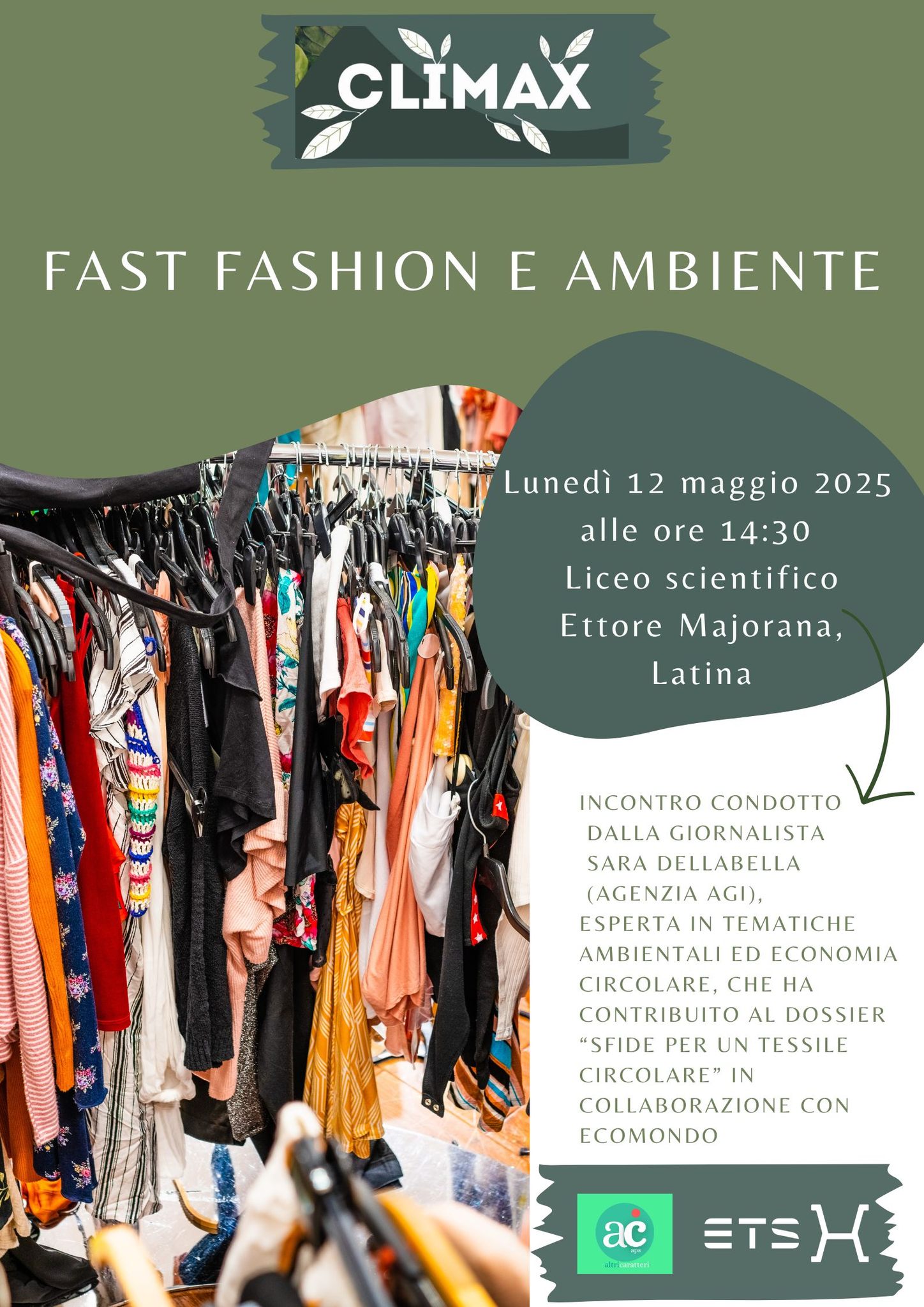 Volge al termine il progetto CLIMAX, l’iniziativa organizzata dall’APS Altri Caratteri presso il Liceo Scientifico Ettore Majorana di Latina per sensibilizzare gli studenti sui grandi temi della sostenibilità ambientale. Dopo un percorso che ha toccato argomenti fondamentali come risparmio energetico, riciclo, alimentazione sostenibile, cambiamento climatico, sostenibilità aziendale e mobilità, il ciclo di incontri si chiuderà oggi, lunedì 12 maggio 2025, con un focus sulla fast fashion e il suo impatto ambientale. A guidare l’ultimo appuntamento sarà Sara Dellabella, giornalista dell’agenzia AGI ed esperta di economia circolare, già collaboratrice al dossier “Sfide per un tessile circolare” in sinergia con Ecomondo. L’incontro prevede una parte introduttiva dedicata all’analisi del fenomeno fast fashion, seguita da un momento interattivo con un quiz rivolto agli studenti, per stimolare riflessioni e partecipazione attiva.