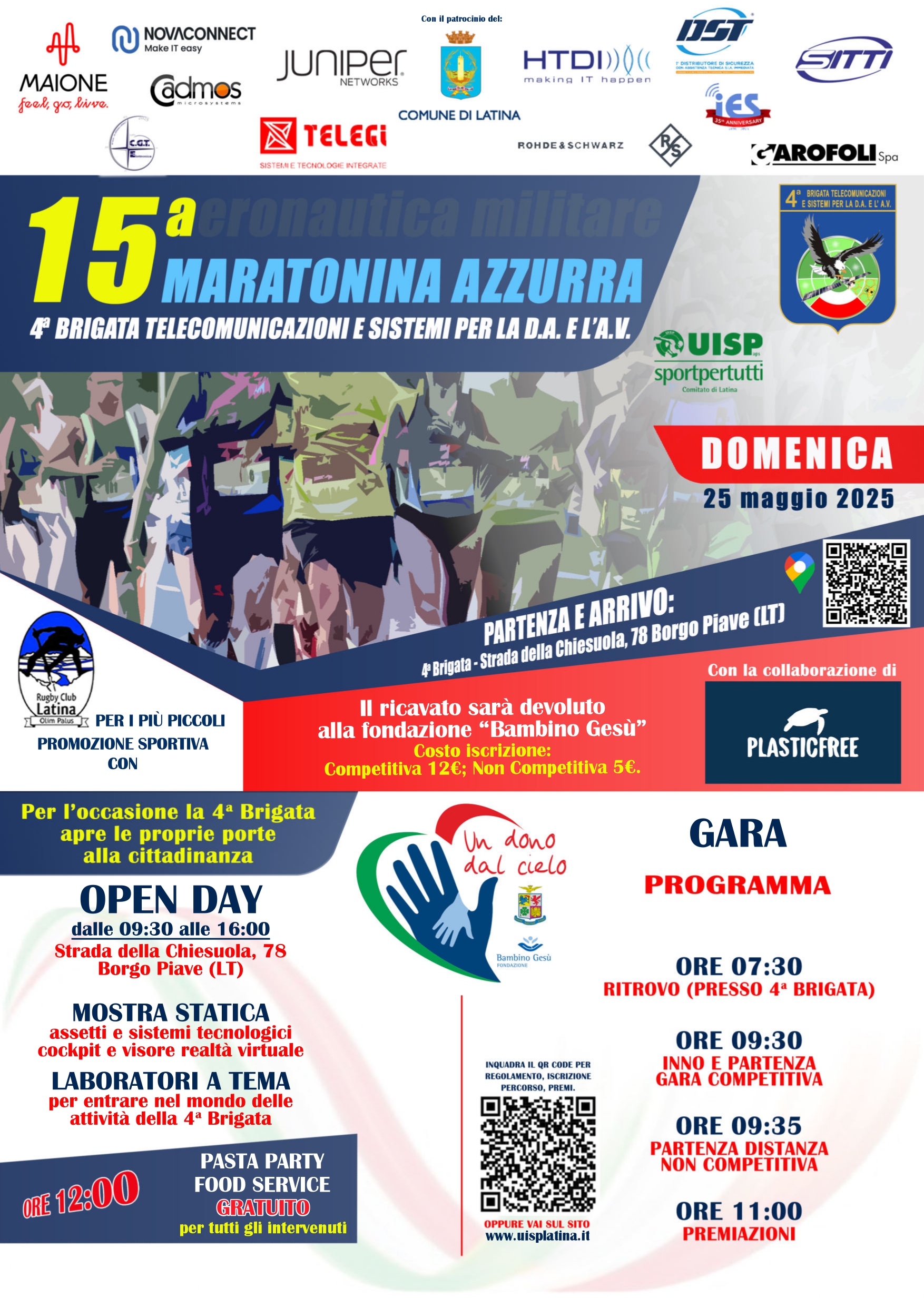 Un appuntamento atteso e consolidato, che unisce passione per lo sport, impegno sociale e spirito di comunità. La gara, con partenza e arrivo all’interno del sedime della Brigata, si snoderà lungo un percorso cittadino di 11 km, attraversando simbolicamente anche Piazza del Popolo, cuore della città e segno tangibile del legame tra l’Aeronautica e il territorio pontino.