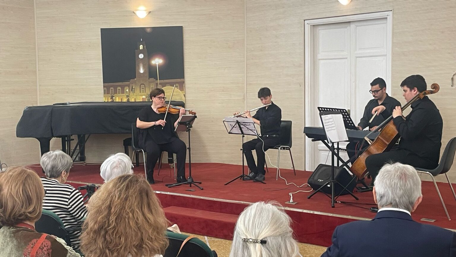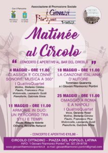 Ultimo incontro, ultimo brindisi, ma soprattutto ultimo viaggio musicale per salutare una rassegna che ha saputo trasformare le mattine domenicali in piccoli momenti di magia. Domenica 25 maggio, alle ore 11.00, il Circolo Cittadino “Sante Palumbo” propone l’ultimo appuntamento di “Concerto & Aperitivo al Bar del Circolo”, l’iniziativa nata dalla collaborazione tra il Circolo e l’Associazione di Promozione Sociale I Giovani Filarmonici Pontini, con il patrocinio della Provincia e del Comune di Latina. Per il gran finale, il salotto culturale del centro storico si accenderà di passione e nostalgia con un “Omaggio a Roma e a Napoli”, un itinerario musicale tra le melodie più amate del nostro patrimonio popolare. Sul palco, l’eleganza e la vivacità de I Quattro Quartet, con Gerarda Rossi (voce), Stefania Cimino (violino), Francesco Pica (flauto), Leonardo Guidi (violoncello) e Gabriele Silvia (pianoforte), interpreteranno brani che fanno parte della memoria collettiva: Anema e core, Tamurriata nera, Come facette mammeta, Dicitencello vuje, Roma non fa la stupida stasera, O sole mio… e molte altre perle della tradizione. Più di un concerto, un abbraccio tra generazioni, un ponte tra culture, un invito a vivere la musica non solo come intrattenimento, ma come parte di noi. E, come sempre, alla musica si unirà un gustoso aperitivo, per condividere impressioni e sorrisi tra un calice e una nota.
