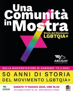 Si inaugura oggi 17 maggio 2025 alle ore 18:30, presso la sede di Arcigay Latina Seicomesei in via Aurelio Saffi 42/44, la mostra sulla storia LGBTQIA+” dal titolo ”Una comunità in mostra”. Un percorso espositivo che ripercorre le tappe fondamentali del movimento per i diritti LGBTQIA+ in Italia e nel mondo.