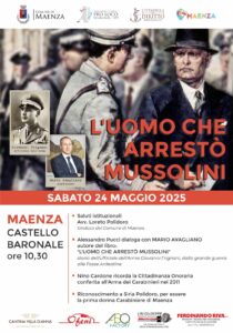 Sabato 24 maggio alle ore 10.30, presso il Castello Baronale, lo scrittore Mario Avagliano su iniziativa del Comune di Maenza e della Proloco, presenterà “L’uomo che arrestò Mussolini”, che tratta la storia del tenente dell’arma dei carabinieri Giovanni Frignani.
