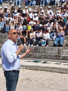 Ad aprire l’incontro, il saluto istituzionale del Presidente della Provincia di Latina, Gerardo Stefanelli, che ha espresso con entusiasmo la sua gratitudine a studenti, insegnanti e organizzatori: “Vedere così tanti giovani in un luogo carico di storia è il segno più forte che la cultura è viva. Che ci faccio QUI? non è solo un titolo, è una domanda fondamentale, un investimento nel futuro della nostra comunità. Nessuno ha scelto di nascere, eppure siamo qui. Ci hanno insegnato a mangiare, a camminare, ma nessuno ci ha dato il libretto d’istruzioni per vivere. E allora nel cammino della vita, tra il desiderio e il senso, scopriamo che, nonostante tutto, la vita è bella.» Il Presidente ha inoltre ringraziato la Direzione del Museo Lazio e il Parco Archeologico di Minturnae, i fratelli Campino e l’Associazione Tuttilibri, rivolgendosi infine ai ragazzi con un augurio speciale: «Vi auguro una splendida estate piena di salsedine, baci ed emozioni”: