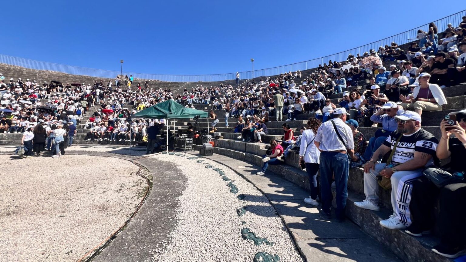 Una mattinata memorabile al Teatro Romano del Parco Archeologico di Minturnae ha segnato la chiusura della rassegna culturale “Che ci faccio QUI?”, promossa dalla Provincia di Latina e curata con passione da Riccardo Campino e dall’Associazione Tuttilibri. L’ospite d’onore, Simone Cristicchi, ha saputo emozionare e ispirare oltre 1000 studenti provenienti da tutta la provincia, trasformando l’evento in una vera festa della cultura e del pensiero critico. Cristicchi, artista poliedrico e autore dall’animo profondamente umano, ha intrecciato musica, parole e riflessioni in un racconto vibrante, toccando i grandi temi dell’esistenza e accendendo nei giovani l’urgenza della domanda: “Che ci faccio qui?”. Con una poetica accessibile e intensa, ha condiviso pensieri tratti dalle sue opere, incentrati sul talento, sull’identità e sulla responsabilità di dare senso alla propria unicità.