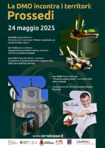 Sabato il Comune di Prossedi si trasformerà nel palcoscenico naturale di un progetto innovativo per tutto il nostro territorio: la “DMO Terre dell’Olio dei Papi”. Un racconto innovativo che parte dalla voglia di valorizzare una nostra eccellenza gastronomica, l’olio d’oliva, per raggiungere la promozione del nostro paese e delle sue straordinarie risorse culturali, storiche e paesaggistiche.