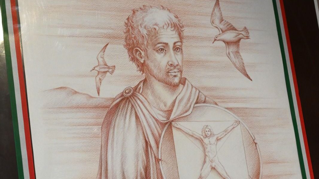 “Campeggia tra le mani del nostro un medaglione circolare con all’interno l’effige dell’uomo vitruviano – spiega ancora – questo elemento è stato inserito in quanto emblema e canone di tutte le discipline scientifiche ed estetiche relative allo studio anatomico e delle proporzioni del corpo umano, ripreso e rielaborato da Leonardo da Vinci nel Cinquecento”.