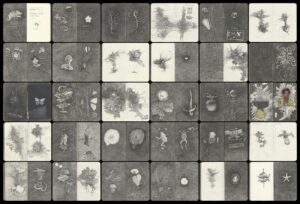 Tre taccuini, con disegni a penna, sono poi il cuore del Viaggio diaristico, in cui Lelario apre le pagine di un diario visivo e conduce l’osservatore all’interno dei territori del pensiero e dell’inconscio. Queste minute esplorazioni compongono un universo intimo in cui micro e macrocosmo si intrecciano in un poema di forme, rivelando enigmi e visioni trattenute dalla superficie della carta. I taccuini di viaggio si trasformano così in tela dell’inconscio: mappe intime dove il segno disegna il paesaggio dell’anima, in un racconto visivo sospeso tra coscienza e sogno.