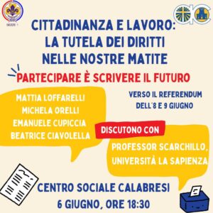In vista del referendum dell’8 e 9 giugno, il Centro Sociale Calabresi di Sezze ospiterà venerdì 6 giugno alle 18:30 l’incontro pubblico “Cittadinanza e lavoro: la tutela dei diritti nelle nostre matite”. Un evento pensato per informare e coinvolgere i cittadini, soprattutto i più giovani, su temi fondamentali legati al diritto al lavoro e alla partecipazione democratica. Tra i promotori dell’iniziativa, l’AGESCI Sezze 1 e l’Azione Cattolica Santa Maria, uniti dallo slogan “Partecipare è scrivere il futuro”. A discutere con il pubblico ci sarà anche il professor Scarchillo dell’Università La Sapienza, accanto a Mattia Loffarelli, Michela Orelli, Emanuele Cupiccia e Beatrice Ciavolella.