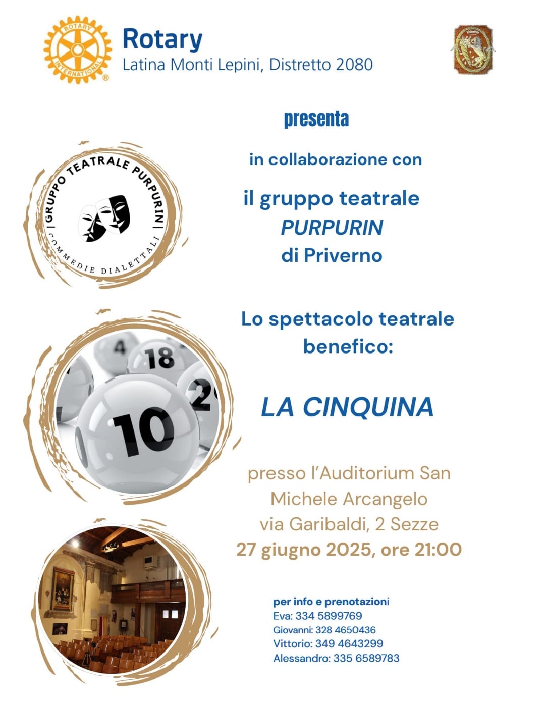 Il palcoscenico dell’Auditorium San Michele Arcangelo di Sezze si prepara ad accogliere un evento di grande rilevanza artistica e sociale. Venerdì 27 giugno prossimo, alle ore 21:00, il rinomato gruppo teatrale di Priverno, “PURPURIN”, porterà in scena il suo acclamato spettacolo “La Cinquina”. Un appuntamento imperdibile che unisce il piacere dell’arte drammatica alla nobiltà della beneficenza, grazie alla preziosa collaborazione del Rotary Club Latina Monti Lepini, Distretto 2080. L’iniziativa, fortemente voluta e promossa dal Rotary, riflette la missione del club di servire la comunità e sostenere progetti di solidarietà. È con grande entusiasmo che il Rotary Club Latina Monti Lepini annuncia che parte del ricavato della serata sarà devoluto per l’acquisto di una stampante o di uno strumento medico da donare all’ Avis Comunale di Sezze. “La Cinquina” non è quindi solo uno spettacolo, ma un veicolo concreto per generare fondi destinati a migliorare le attrezzature mediche locali. Questa sinergia tra cultura e filantropia è un esempio lampante di come l’impegno civico possa concretizzarsi attraverso espressioni artistiche, con un impatto diretto e tangibile sulla salute della comunità.
