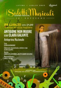 All’interno della rassegna “Latina Estate 2025”, promossa dall’assessorato al Turismo del Comune di Latina, arriva un evento speciale che unisce teatro, poesia e riflessione civile: l’anteprima nazionale dello spettacolo “Antigone non muore”, a cura dell’associazione Eleomai, nell’ambito dei Salotti Musicali – Summer Festival.