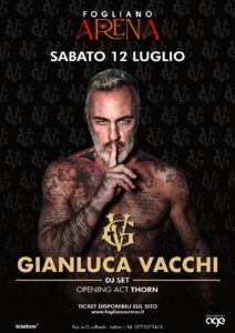 Con singoli come Trump-It e Viento, Vacchi dimostra talento non solo nella performance ma anche nella produzione musicale, sempre affiancato da team di altissimo livello. Il suo motto, “Enjoy”, è anche il titolo della sua autobiografia pubblicata da Feltrinelli nel 2016, manifesto di uno stile di vita fatto di passione, libertà e visione imprenditoriale. Ad aprire le danze sul palco sarà Thorn, dj e vocalist tra i più richiesti dai club italiani, da Jesolo a Milano Marittima, pronto a scaldare l’atmosfera in Arena con una selezione musicale travolgente.