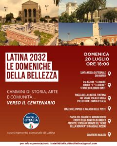 Il coordinamento comunale di Fratelli d’Italia di Latina invita tutta la cittadinanza a partecipare all’appuntamento con “Le Domeniche della Bellezza“, in programma domenica 20 luglio alle ore 18:00, per un coinvolgente percorso tra memoria, arte e identità.