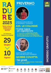 – sabato 19 luglio – Dalle ore 18.00 Nel Parco Archeologico di Priverno: Visite guidate, apertura stand gastronomico, alle ore 21.00 “Sei Gradi di Giobbe Covatta” con la partecipazione di Ugo Gangheri, uno spettacolo di Giobbe Covatta e Paola Catella , Costumi: Chiara Defant Produzione Papero srl (info https://www.compagniadeilepini.it/…/radure-2025…/).