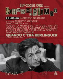 Per i due ultimi appuntamenti della rassegna, realizzata con il patrocinio del Comune di Roma, la collaborazione di Eur Spa insieme al media partner Eur District Municipio IX, il direttore artistico Scuderi ha scelto volutamente due personaggi emblematici di quegli anni Aldo Moro, raccontato la scorsa settimana attraverso il film “Piazza delle Cinque Lune”, ed Enrico Berlinguer, che sarà ricordato grazie al film di Walter Veltroni, “Quando c’era Berlinguer” il prossimo 22 luglio ore 20.45. Ancora una volta un documento visivo per arrivare al pubblico e trasferire un messaggio alle nuove generazioni per non dimenticare il passato del nostro paese e comprendere il valore di quelle intese e quei legami che hanno cambiato il presente e il futuro.