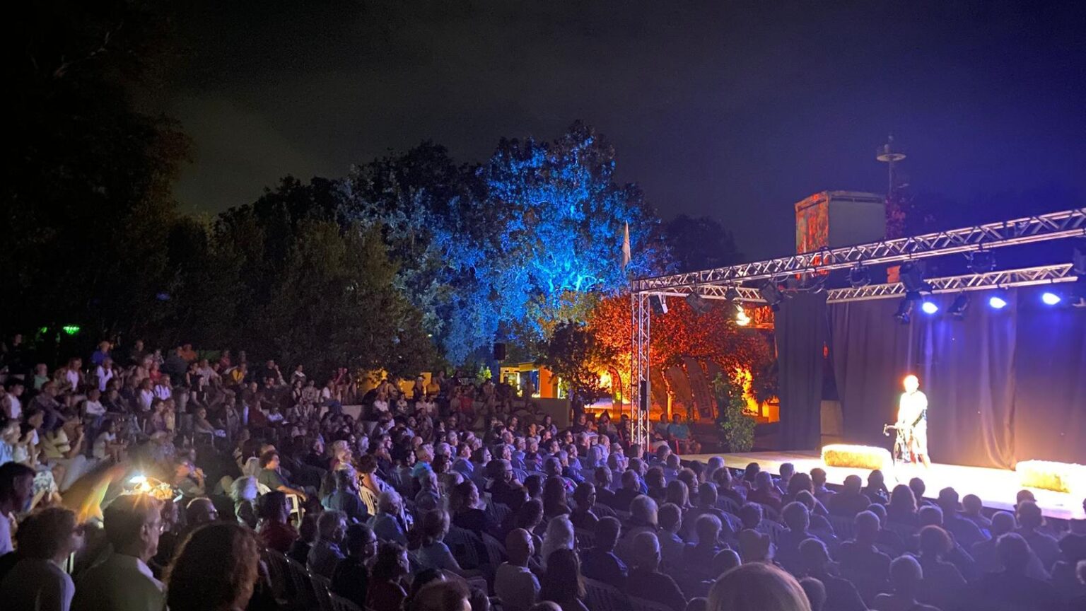Venerdì 1° agosto, nuovo cambio di scena e di tono. La compagnia Le Colonne, diretta da Giancarlo Loffarelli, dopo il pluripremiato “10giugnoventiquattro” apre una nuova pagina della storia recente con “55 Giorni”, spettacolo dedicato al sequestro Moro. In scena solo tre cubi e tre colori: bianco, nero e rosso. Il bianco è il colore della ricerca della verità: bianco è il telo che all’inizio dello spettacolo copre la scena e viene sollevato nel tentativo di svelare ciò che ancora, dopo 47 anni, cela la verità. Bianche sono le luci che cercano di illuminare quella verità, ma che diventano progressivamente sempre più fioche. Nero è il buio in cui restano ancora immersi tanti elementi della vicenda.