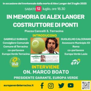 L’evento intitolato “IN MEMORIA DI ALEX LANGER COSTRUTTORE DI PONTI” che si svolgerà sabato 12 luglio alle ore 18.30 presso la sede di Europa Verde Terracina a Piazza Cancelli 3 è stato organizzato da Europa Verde Terracina, con il supporto di Europa Verde Lazio e dei Giovani Europeisti Verdi Lazio, patrocinato dalla Scuola di Formazione Politica e Culturale Alex Langer di Trento e con la media partnership della Rivista “Ecologica” https://www.ecologica.online/ecologica-online/ che dedica nell’ultimo numero (n.2) del 2025 uno speciale proprio ad Alex Langer.