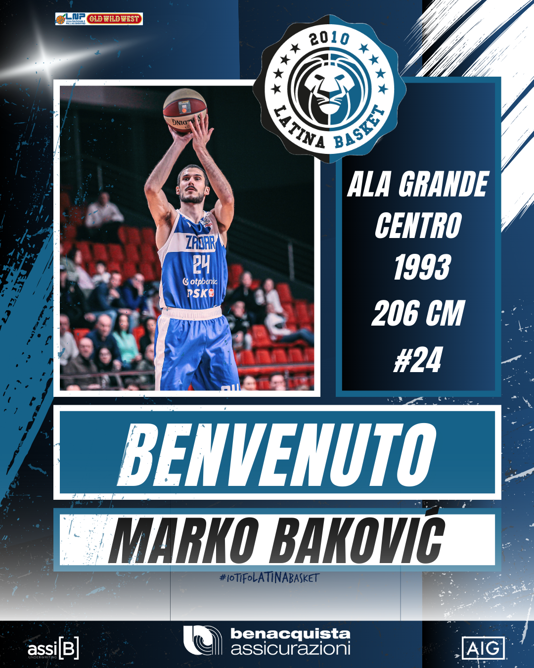 La Benacquista Assicurazioni Latina Basket è lieta di comunicare ufficialmente di aver raggiunto un accordo con l’atleta di nazionalità croata Marko Baković, ala grande/centro, classe 1993 di 206 cm di altezza e 93 kg di peso.