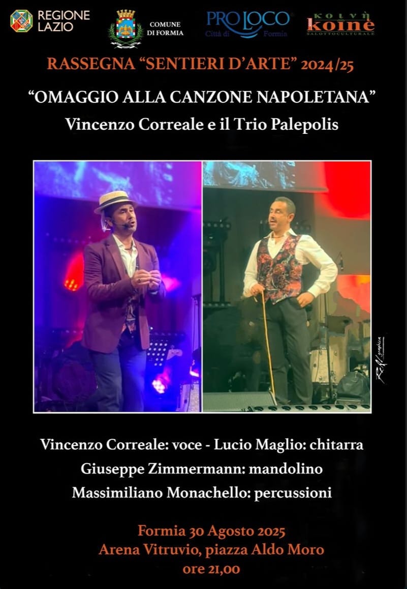 Il 30 agosto 2025, alle ore 21.00, presso l’Arena Vitruvio in Piazza Aldo Moro, si terrà lo spettacolo patrocinato dal Comune di Formia “Omaggio alla Canzone Classica Napoletana”, inserito nel cartellone della rassegna Sentieri d’Arte 2025.