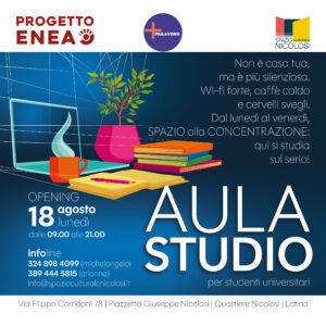 Su iniziativa dell’APS PiuLavoro, dell’Associazione politico-culturale Progetto Enea e dello Spazio Culturale Nicolosi, sta per nascere nel cuore di Latina un nuovo punto di riferimento per studenti, freelance e amanti del silenzio produttivo. Il prossimo 18 agosto verrà inaugurata la nuova aula studio gratuita presso lo Spazio Culturale Nicolosi, un ambiente pensato per offrire uno spazio accogliente, attrezzato e tranquillo a chi cerca concentrazione, ispirazione e condivisione.