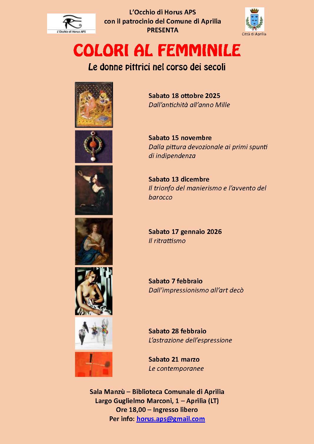 Prenderà avvio sabato 18 ottobre alle ore 18,00, presso la Sala Manzù della Biblioteca Comunale, il ciclo di incontri “Colori al femminile” organizzato dall’Associazione L’Occhio di Horus APS, con il patrocinio del Comune di Aprilia, e tenuto da Mario Lupini, cultore di storia dell’arte. Un viaggio affascinante e inedito attraverso la storia dell’arte vista con gli occhi delle donne: è questo l’obiettivo di “Colori al femminile”, il ciclo di incontri che ripercorre la produzione artistica femminile dall’antichità fino alla contemporaneità. Attraverso sette lezioni tematiche, il pubblico sarà accompagnato alla scoperta di figure straordinarie – spesso dimenticate o trascurate dalla storiografia ufficiale – che hanno contribuito con il loro talento, la loro sensibilità e la loro audacia a plasmare linguaggi e movimenti artistici. Il primo appuntamento, previsto per sabato 18 ottobre, con il titolo “Dall’antichità all’anno 1000”, opera un excursus tra le prime testimonianze di artiste tramandate dagli scritti di Plinio il Vecchio e ricordate da Boccaccio, come Irene, Timarete e Iaia di Cizico, citando Gisele, sorella di Carlo Magno, e giungendo fino alle monache miniaturiste medievali – Claricia, Guda ed Ende – che hanno lasciato opere raffinate sugli incunaboli. Un viaggio tra memoria e fragilità delle fonti, che restituisce il segno di presenze femminili precoci ma decisive. L’incontro di sabato 15 novembre, “Dalla pittura devozionale ai primi spunti di indipendenza”, illustra come nel Medioevo e nel primo Rinascimento, i conventi diventino luoghi di formazione e di produzione artistica: Herrad von Landsberg, Teresa Diec e Plautilla Nelli traducono la loro forza spirituale in pittura. Parallelamente, la figura ribelle di Properzia de’ Rossi, scultrice fuori dagli schemi, con la sua audacia laica apre alla possibilità di un’autonomia femminile nell’arte, pur tra scandali e difficoltà. Sabato 13 dicembre con “Il trionfo del manierismo e l’avvento del barocco”, approfondiremo l’età d’oro delle pittrici italiane: Sofonisba Anguissola, amata dalle corti europee, Lavinia Fontana, prima donna a ottenere commissioni pubbliche, Artemisia Gentileschi, simbolo di coraggio e maestria, ed Elisabetta Sirani, virtuosa del barocco bolognese. Quattro artiste di grande talento che seppero conquistare spazi di visibilità e riconoscimenti in un mondo dominato dagli uomini. Superato il periodo natalizio, sabato 17 gennaio sarà la volta de “Il ritrattismo”, cioè del ritratto come strumento di affermazione e di riconoscimento sociale. Dalla precisione di Fede Galizia alla grazia rococò di Rosalba Carriera, fino all’eleganza cosmopolita di Angelica Kauffmann e alle scene sofisticate di Élisabeth Vigée Le Brun, pittrice prediletta dalle corti francesi e simbolo dell’arte al femminile tra Illuminismo e Rivoluzione. Il quinto incontro, previsto per sabato 7 febbraio, descrive il contributo femminile nel passaggio “Dall’impressionismo all’art decò”. Nell’Ottocento e nel primo Novecento le artiste entrano nei movimenti che rivoluzionano il linguaggio pittorico: Berthe Morisot e Mary Cassatt portano lo sguardo femminile nell’impressionismo, Suzanne Valadon attraversa Fauvismo e Cubismo con audacia e libertà, Tamara de Lempicka incarna lo stile inconfondibile e glamour dell’Art Déco. Sabato 28 febbraio, con il titolo L’astrazione dell’espressione, vengono presentate quattro donne, quattro personalità inconfondibili, quattro percorsi unici che sfidano le categorie critiche: la potenza autobiografica e dolorosa di Frida Kahlo, la testimonianza struggente di Charlotte Salomon, la forza pop e gioiosa di Niki de Saint Phalle, la delicatezza rigorosa di Georgia O’Keeffe. Diversissime, ma accomunate dal trasformare la propria vita in linguaggio artistico. L’ultimo incontro, previsto per sabato 21 marzo, si concentrerà sulle contemporanee. Uno sguardo sull’Italia del Novecento: Carla Accardi, tra le protagoniste dell’astrattismo europeo, Bice Lazzari, poetessa della forma e del segno, e Ketty La Rocca, che con la sua ricerca gestuale e concettuale ha aperto nuove strade nell’arte contemporanea. Un finale che riporta al presente, mostrando come l’eredità femminile sia tuttora viva e fertile. Il ciclo “Colori al femminile” offre dunque un’occasione preziosa non solo per approfondire la conoscenza di grandi artiste, ma anche per riflettere sul ruolo delle donne nella storia culturale, sociale e politica di ieri e di oggi.