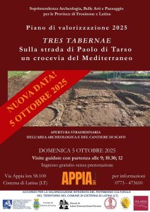 Dopo il successo di visitatori domenica scorsa per le Giornate Europee del Patrimonio (oltre 300 in sole 4 ore), l’importante sito archeologico di Tres Tabernae riaprirà straordinariamente al pubblico domenica mattina, 5 ottobre, per celebrare l’Appia Day. L’iniziativa, intitolata “Tres Tabernae. Sulla strada di Paolo di Tarso, un crocevia del Mediterraneo”, offrirà ai visitatori la possibilità di accedere gratuitamente, senza prenotazione, all’area archeologica e al cantiere di scavo sita a Cisterna di Latina al km 58.100.