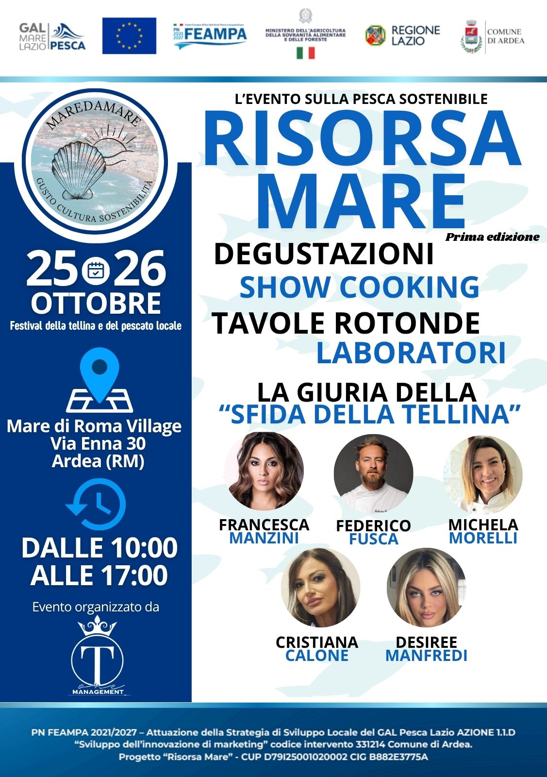 Il conto alla rovescia è terminato. Domani, sabato 25 e domenica 26 ottobre, dalle ore 10:00 alle 17:00, il Mare di Roma Village di Ardea, in Via Enna 30, aprirà le porte a “Risorsa Mare”, il nuovo evento dedicato alla valorizzazione del patrimonio marino e costiero del litorale laziale. Promosso dal Comune di Ardea nell’ambito del PN FEAMPA 2021/2027 e della Strategia di Sviluppo Locale del GAL Pesca Lazio, il progetto – curato da Giotto ADV con la collaborazione di T.One Management S.R.L. e Onirika Edizioni – nasce con l’obiettivo di promuovere la pesca sostenibile, l’acquacoltura locale e la cultura enogastronomica legata al mare, mettendo in rete realtà istituzionali, produttive e culturali del territorio.