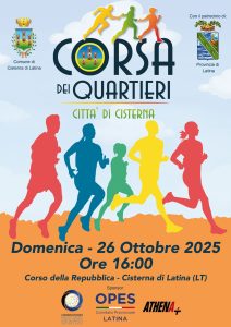 Torna domenica 26 ottobre la “Corsa dei Quartieri Città di Cisterna”, la manifestazione podistica non competitiva che anima ogni anno il centro cittadino. Il programma di questa edizione 2025 prevede la partenza degli atleti – sono una sessantina quelli che si sono iscritti alla gara – alle ore 16 da Corso della Repubblica, poi si proseguirà su un tracciato urbano che da via Quattro Giornate di Napoli si snoderà fino al civico 380, per poi tornare indietro. Lungo questo percorso si sfideranno squadre composte ciascuna da sei atleti, in una staffetta che celebra l’identità dei quartieri di Cisterna e il valore del fare squadra. Ogni atleta percorrerà due giri da 500 metri, per un totale di 1.000 metri per squadra. Il passaggio del testimone avverrà sotto gli archi gonfiabili allestiti per l’occasione, rendendo ancora più suggestiva l’atmosfera della gara.