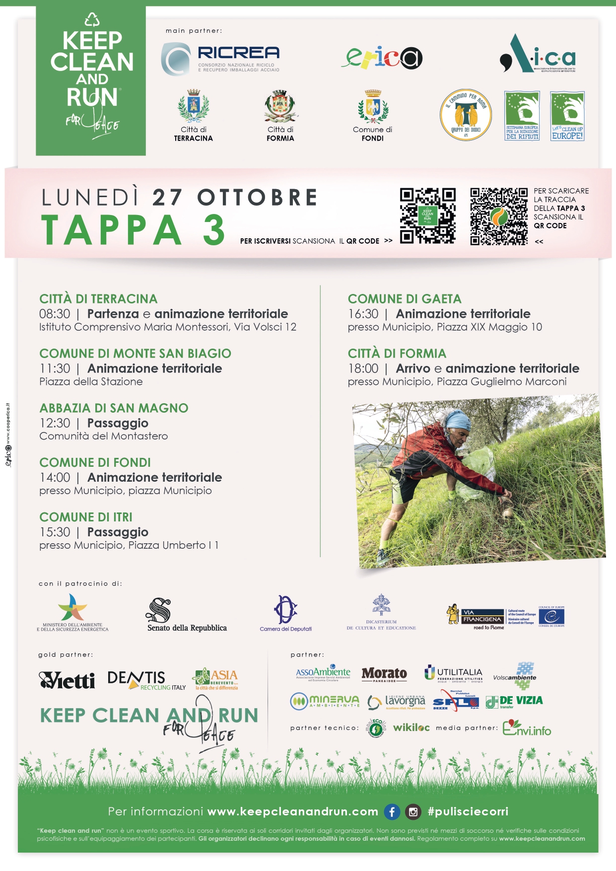 Dopo aver percorso gran parte del territorio nazionale nelle precedenti dieci edizioni, quest’anno Keep Clean and Run prenderà il via sabato 25 ottobre da Albano Laziale, passando per Velletri e attraversando i Colli Albani fino a Sermoneta. Domenica 26 ottobre la corsa proseguirà verso il litorale, con arrivo a Terracina, da cui il giorno seguente, lunedì 27 ottobre, si ripartirà per raggiungere Formia, città affacciata sul mare. La quarta tappa, martedì 28 ottobre, condurrà i plogger verso l’entroterra campano, fino a Teano, mentre mercoledì 29 ottobre il percorso unirà Teano a Faicchio, nel cuore del Sannio. Giovedì 30 ottobre l’ultima tappa porterà all’arrivo nella storica città di Benevento, dove si concluderà questa edizione simbolica e partecipata.