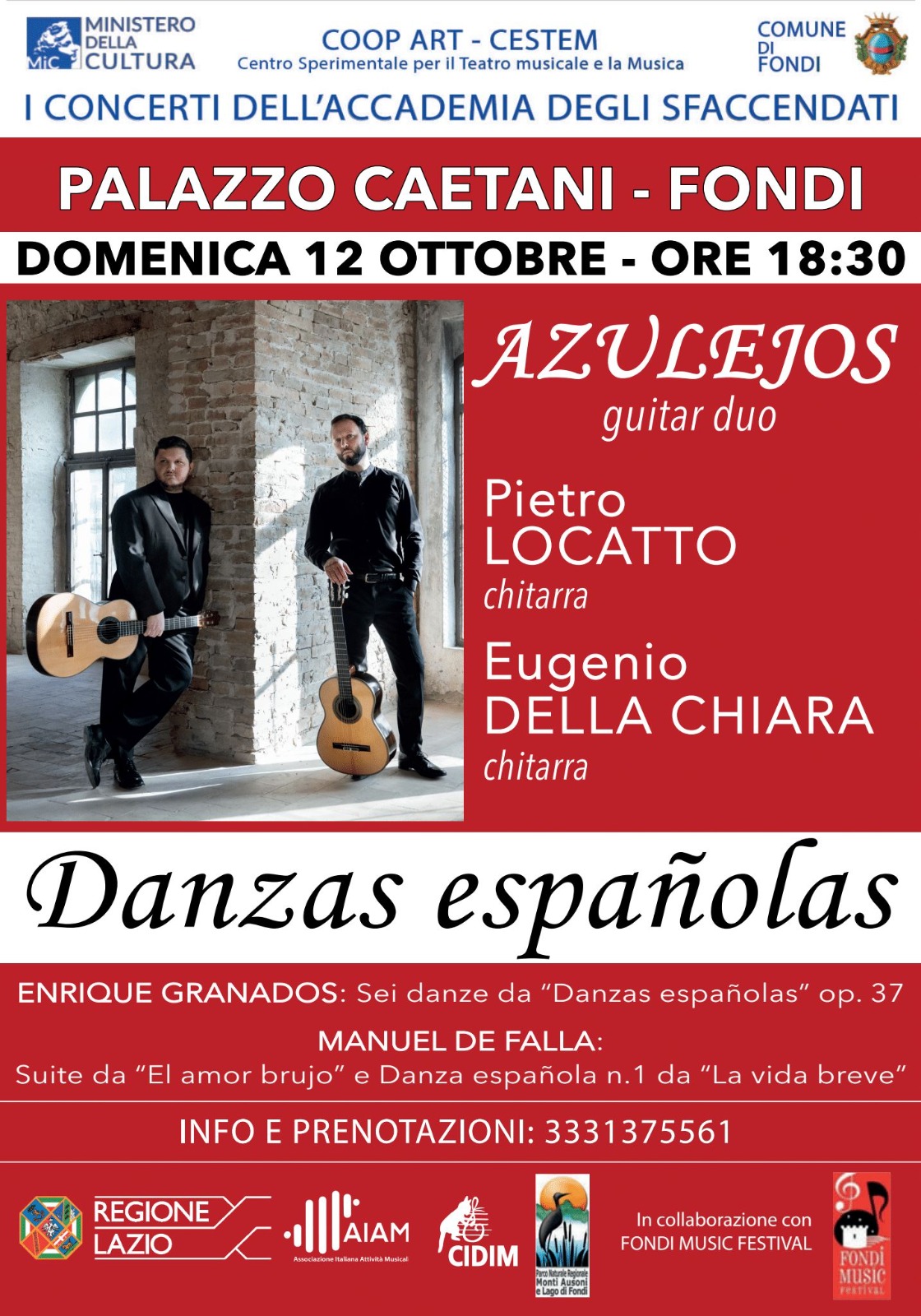 Il primo concerto – domenica 12 ottobre con inizio alle ore 18:30 – è dedicato alle Danzas Españolas che i due bravissimi chitarristi Eugenio Della Chiara e Pietro Locatto proporranno nella bella sala di Palazzo Caetani a Fondi.