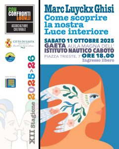 Torna a Gaeta l’appuntamento con la cultura, la riflessione interiore e il dialogo spirituale. Sabato 11 ottobre 2025, alle ore 18.00, l’Aula Magna dell’Istituto Tecnico Nautico G. Caboto ospiterà il secondo incontro della 12ª stagione dell’Associazione Confronti, dal titolo: “Come scoprire la nostra luce interiore”.