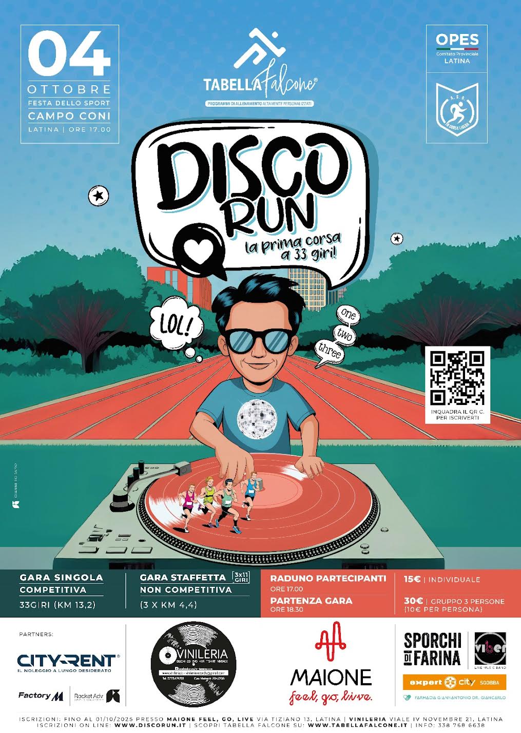 Il 4 ottobre 2025, al Campo Coni di Latina, andrà in scena la Disco Run, la prima corsa a 33 giri che unisce sport, musica ed emozioni in un format unico. L’evento rientra nelle due giornate della Festa dello Sport (4 e 5 ottobre), organizzata con il supporto di Opes.