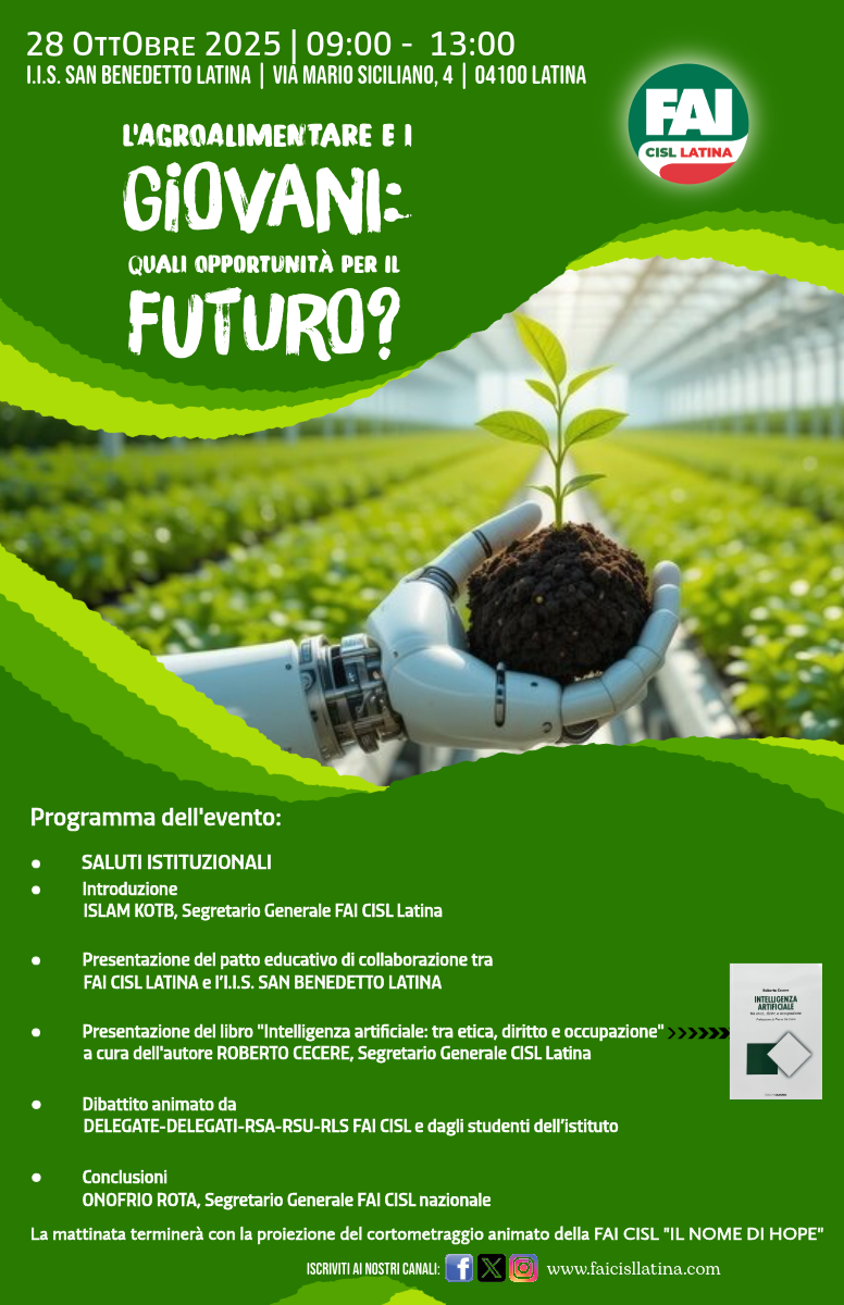 La mattinata si aprirà con i saluti istituzionali e l’intervento introduttivo di Islam Kotb, Segretario Generale FAI CISL Latina. Seguirà la presentazione del patto educativo di collaborazione tra la FAI CISL Latina e l’I.I.S. San Benedetto, un accordo che sancisce l’impegno comune nel promuovere la cultura del lavoro, la sostenibilità e la formazione dei giovani in un settore chiave per il territorio pontino. A seguire, Roberto Cecere, Segretario Generale CISL Latina, presenterà il suo libro “Intelligenza artificiale: tra etica, diritto e occupazione”, offrendo spunti di riflessione sul rapporto tra tecnologia e futuro del lavoro. Il dibattito sarà animato dai delegati e rappresentanti della FAI CISL insieme agli studenti dell’Istituto, in un confronto intergenerazionale ricco di idee e prospettive. La mattinata si concluderà con la proiezione del cortometraggio animato “Il nome di Hope”, regia di Giacomo Salvatelli, realizzato da un collettivo di oltre venti giovani studenti di cinema, musica e animazione.