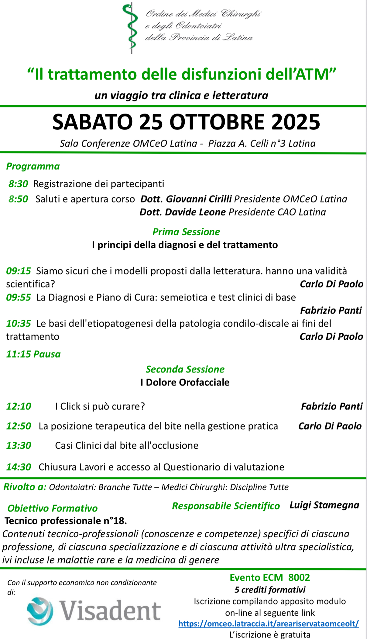 Si terrà sabato 25 ottobre, presso la sala conferenze dell’OMCeO di Latina, in piazza A. Celli n. 3, dalle ore 8:30 alle 14:30, il corso ECM “Il trattamento delle disfunzioni dell’ATM, un viaggio tra clinica e letteratura”, rivolto ai Medici Chirurghi ed Odontoiatri, tutte le Discipline e tutte le Branche.