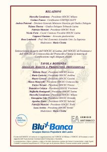 Infatti, dopo la presentazione dei Presidenti Raffaella Romagnoli (LT), Marcella Caradonna (MI) e Domenico Celenza (FR), ed i saluti del Sindaco di Priverno Anna Maria Bilancia, del Presidente della CCIAA FR-LT Giovanni Acampora, del direttore dell’INPS di Latina Maurizio Mauri e del Presidente della Fondazione Telos – ODCEC di Roma inizieranno le relazioni tecniche di: Marcella Caradonna – Pres. ODCEC Milano, Cosimo Franco – Certificatore Certiquality, Andrea Petteruti – Dir. Generale Min. Giustizia, Tiziana Tinessa – Giudice Delegato Sez. Fall.re Tribunale Latina, Fabrizio Mancini – Pres. ODCEC Tivoli, Nicola Forte – Coord. Comm.ne Fiscalità ODCEC Latina, Cappucci Gaetano – Avv. Giuslavorista, Rosa Lombardi – Prof. Ord. Economia Aziendale Università La Sapienza.