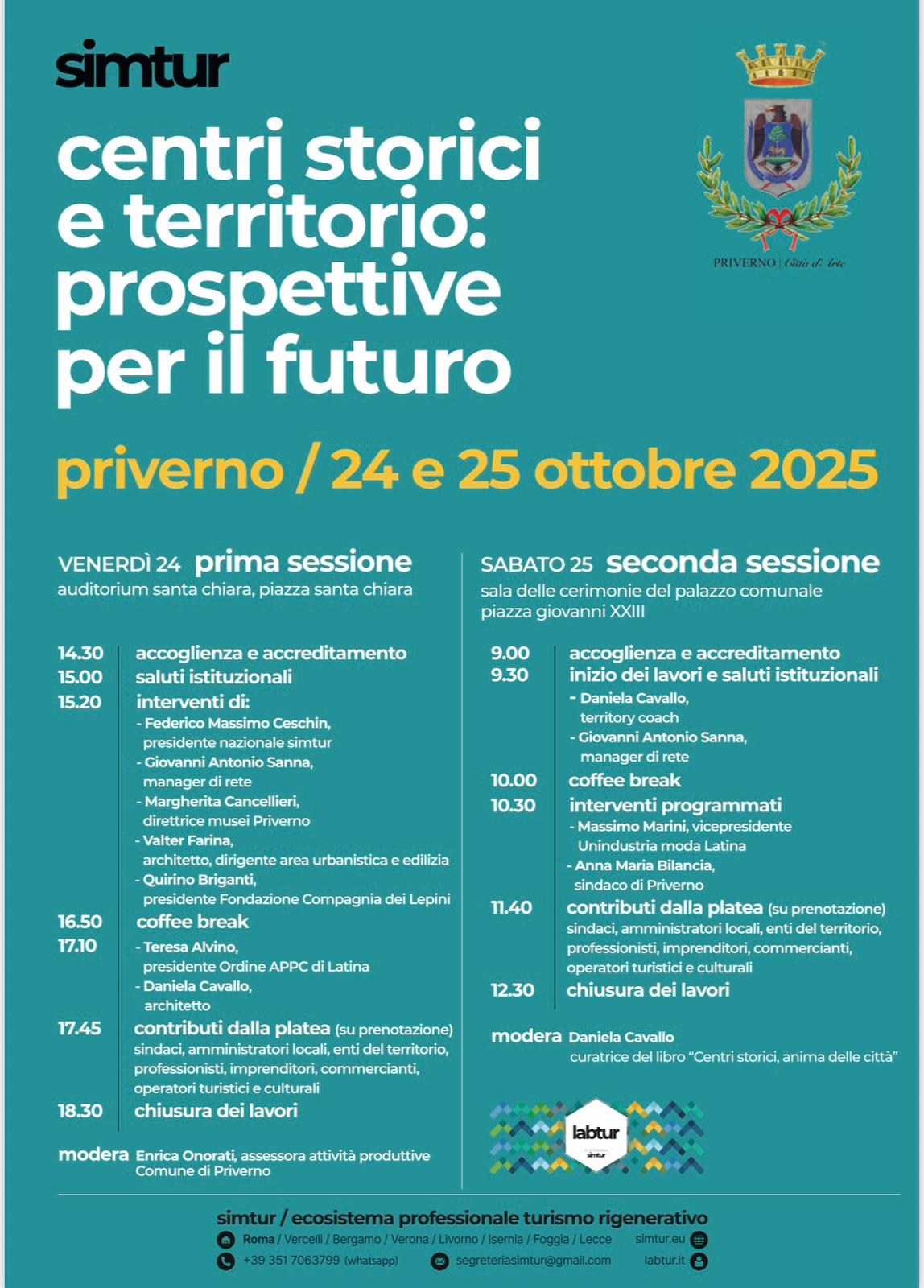 I giorni 24 ottobre e 25 ottobre 2025, rispettivamente nell’Auditorium di Santa Chiara e nella Sala delle Cerimonie del Palazzo Comunale, si terrà il seminario LABTUR SIMTUR “Centri storici e territorio: prospettive per il futuro”.