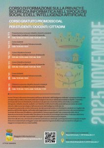 Partirà sabato 8 novembre il corso gratuito dal titolo “Privacy e sicurezza informatica nell’epoca dei social e dell’intelligenza artificiale”, un percorso di formazione di 30 ore strutturato in 6 incontri rivolto, in particolare, a studenti di scuole medie e superiori, ai docenti e ai genitori ma aperto a tutti i cittadini.