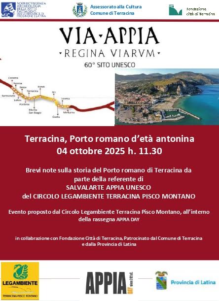 A condurre l’evento sarà l’architetto Maria Luisa Ghianda, referente Salvalarte-Appia UNESCO di Legambiente, con l’obiettivo di raccontare la storia del porto romano di Terracina, uno dei più importanti dell’età imperiale, potenziato dagli Antonini dopo la costruzione della variante traianea della Via Appia. La visita sarà aperta anche ai cicloturisti, essendo collegata al percorso ciclopedonale costiero.