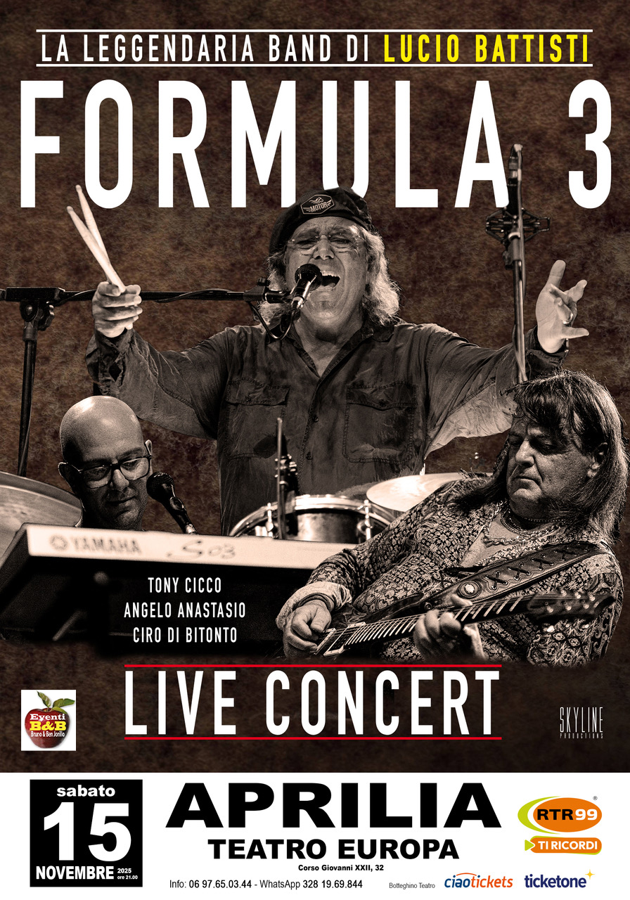 Formula 3, la storica band di Lucio Battisti, guidata dal cantante musicista Tony Cicco, si esibirà in un eccezionale concerto live ricco di sorprese e brani popolari straordinari. Tra i maggiori successi si ricordano Questo folle sentimento, Eppur mi son scordato di te, Io ritorno solo, Sole giallo sole nero, La folle corsa, quest’ultimo brano presentato al Festival di Sanremo 1971 in abbinamento a Little Tony.