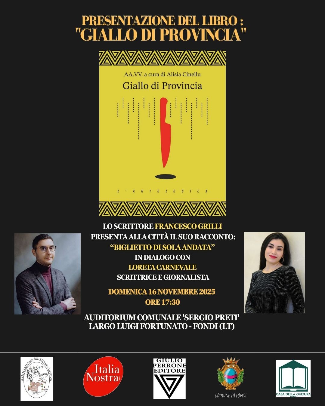 L’Associazione Musicinecultura APS, in collaborazione con l’Associazione Italia Nostra – Sezione di Fondi e dei Monti Ausoni e con il patrocinio del Comune di Fondi e della Casa della Cultura di Fondi, promuove ed organizza la presentazione del libro “Giallo di provincia“, edito dalla casa editrice Giulio Perrone Editore, nel quale è contenuto il racconto “Biglietto di sola andata” del giovane scrittore fondano Francesco Grilli.