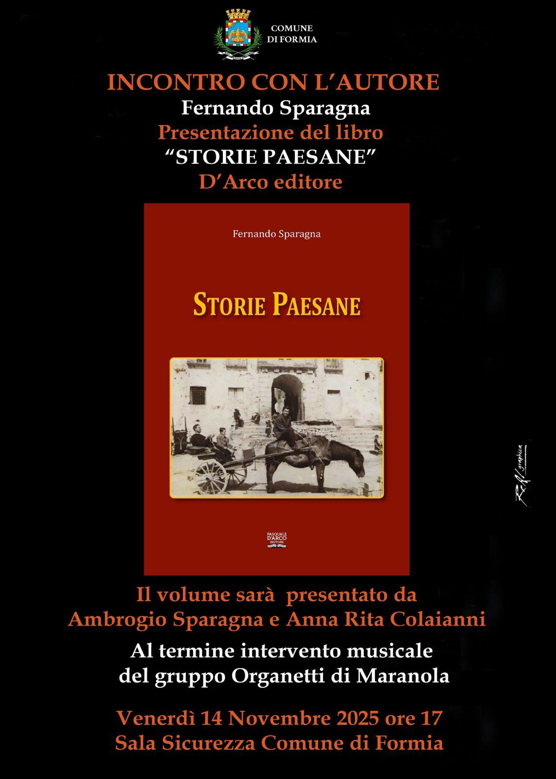 “Storie paesane” è l’ultima opera editoriale di Fernando Sparagna, figura di spicco della cultura formiana. Docente di latino e greco al Liceo Classico “Vitruvio Pollione” per oltre trent’anni, ha al suo attivo un’intensa attività di poeta, scrittore e storico locale. Il suo ultimo lavoro è dedicato a Maranola, suo paese d’origine. Nel volume, costruito attraverso la proposizione di una serie di novelle, Sparagna descrive storie e personaggi di una “Maranola antica” , segnata da una cultura arcaica dove i “paesani“ diventano protagonisti di storie curiose, a tratti drammatiche.